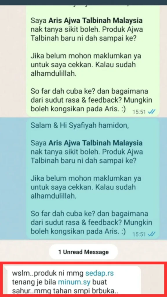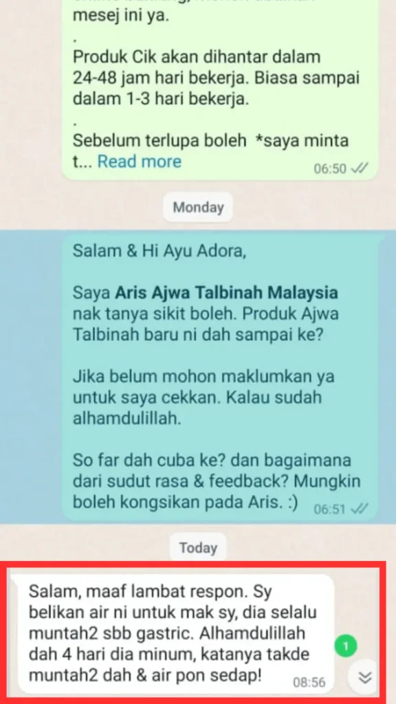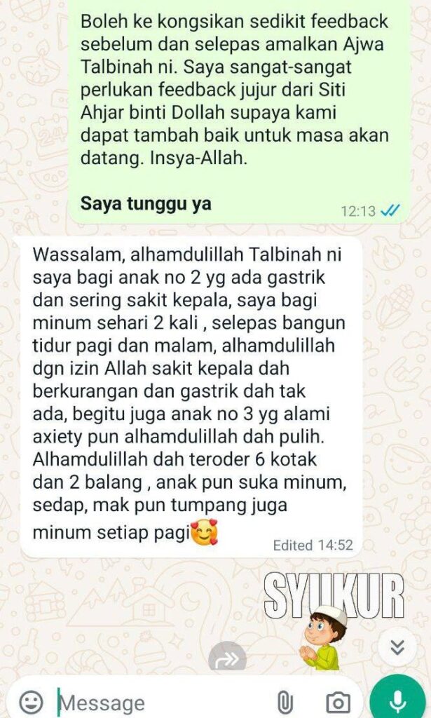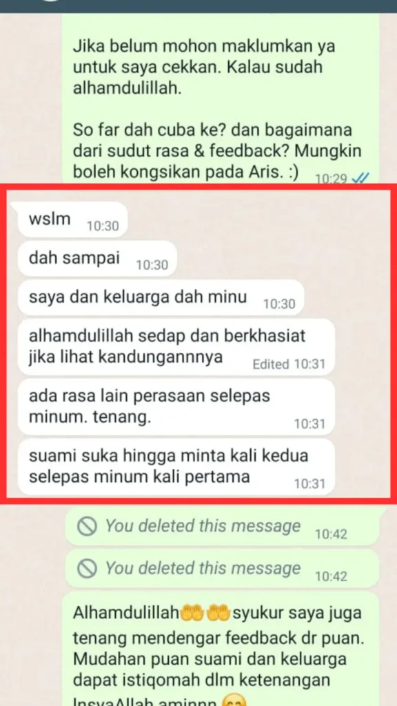 *PENAFIAN: Keberkesanan produk ini bergantung kepada kesesuaian individu. Setiap hasil dari penggunaan adalah berbeza bagi setiap individu. Produk ini akan memberi kesan terbaik sekiranya pengguna mengamalkan dengan cara betul berdasarkan banyak testimoni yang diperolehi. Kita berikhtiar, Allah yang menyembuhkan.
