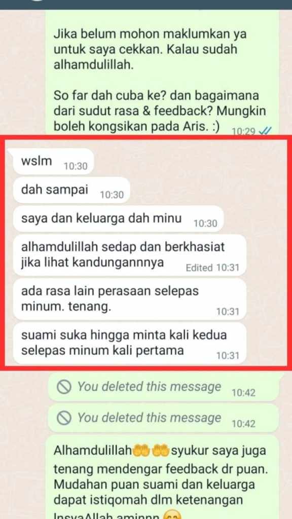 *PENAFIAN: Keberkesanan produk ini bergantung kepada kesesuaian individu. Setiap hasil dari penggunaan adalah berbeza bagi setiap individu. Produk ini akan memberi kesan terbaik sekiranya pengguna mengamalkan dengan cara betul berdasarkan banyak testimoni yang diperolehi. Kita berikhtiar, tuhan yang menyembuhkan.
